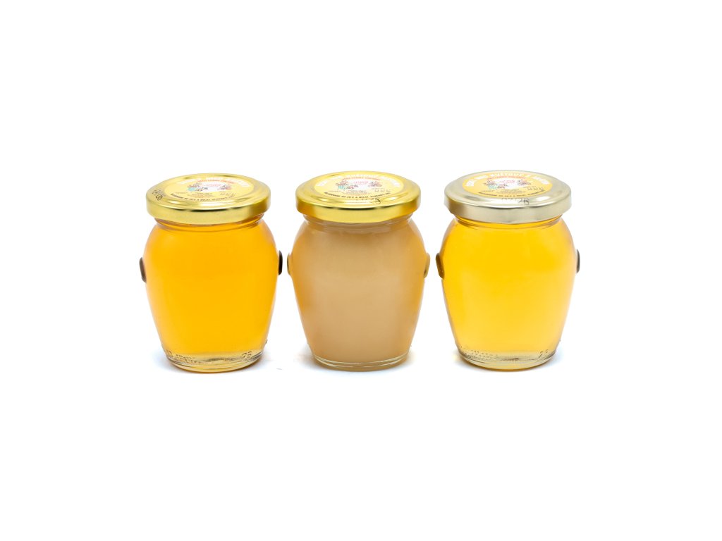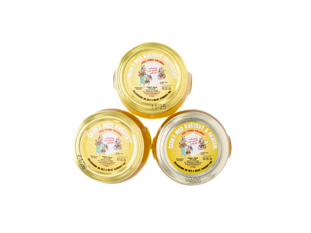 Složení: květový med 180 g + pastovaný med květový 180 g + květový med s akátem 180 g